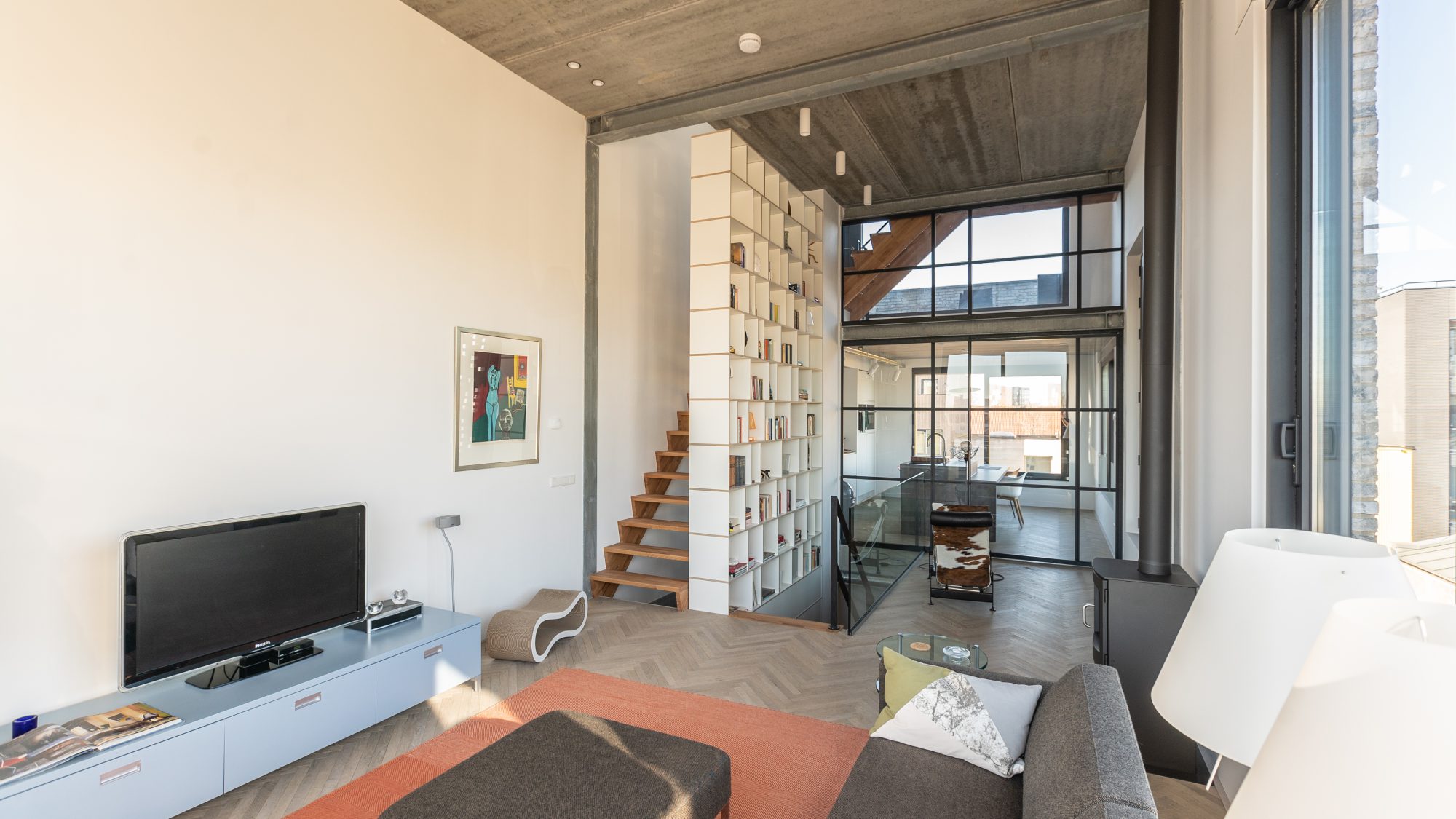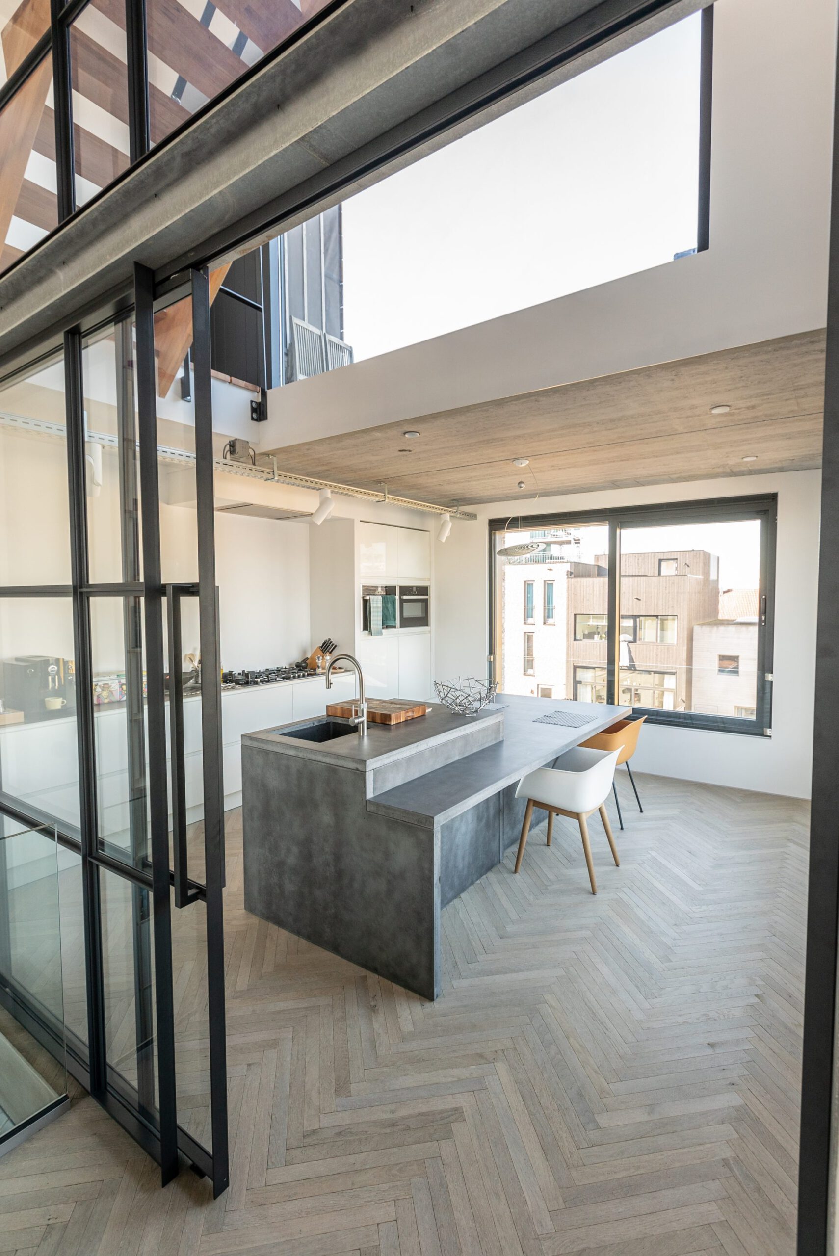 Bijzonder zijn de verschillende niveaus, die ten opzichte van elkaar verspringen. Een van de woonlagen heeft zelfs een vier meter hoog plafond. Ook van deze tijd: de staalconstructies en betonvloeren die in het zicht zijn gebleven. ‘Puur’ en ‘industrieel’, die woorden zijn hier zeker op de plaats. De zwarte stalen deuren geven het huis de juiste finishing touch. Architect: Angela Holterman/HOLLANDS HUIS